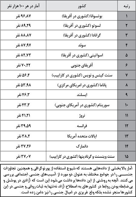 به گزارش دفتر مبارزه با مواد مخدر و جرایم سازمان ملل متحد (UNODC) آمار تجاوزات جنسی گزارش شده در 15 کشور اول دنیا در سال 2023 به ترتیب جدول مقابل هستند: این در حالی است که طبق مطالعهای که توسط بخش زنان سازمان ملل انجام شد، کمتر از 10 درصد از تجاوزات به مقامات قضایی گزارش میشوند. به گزارش شبکه ملی تجاوز، سوءاستفاده و زنای محارم در آمریکا (RAINN) در هر 68 ثانیه یک آمریکایی مورد تجاوز قرار میگیرد و هر 9 دقیقه قربانی آن یک کودک است. این در حالی است که از 1000 مرتکب، تنها 25 نفر به زندان میافتند. از هر 6 زن آمریکایی 1 نفر در طول زندگی خود قربانی اقدام به تجاوز یا تجاوز کامل شده است. از هر 33 مرد آمریکایی 1 نفر در طول زندگی خود با اقدام تجاوز جنسی یا تجاوز کامل مواجه شده است. از سال 2009 تا 2013 آژانسهای خدمات حفاظت از کودکان ثابت کردند که سالانه 63000 کودک قربانی آزار جنسی میشوند. طبق آمار، 55 درصد تجاوزات جنسی در خانه قربانی، 15 درصد در وسایل نقلیه عمومی، 12 درصد در منزل اقوام، 10 درصد در مکانهای عمومی خلوت مثل پارکینگ و 8 درصد در مدرسه رخ میدهند. طبق گزارش دفتر آمار ملی انگلستان و ولز (Ons.gov.uk) در سال 2022 حدود 1/1 میلیون بزرگسال 16 ساله تجاوز جنسی را تجربه کردند. این رقم معادل 798000 زن و 275000 مرد است. تقریبا 16.6 درصد از بزرگسالان بالای 16 سال (7.9 میلیون نفر) شکلی از تجاوز جنسی را از لمس ناخواسته گرفته تا تجاوز کامل تجربه کردهاند. آمار تماشای پورنوگرافی طبق گزارشی که در سال 2023 در مجله آمریکایی ballardbrief منتشر شد 69 درصد از مردان آمریکایی و 27 درصد از زنان از پورنوگرافی استفاده میکنند. در میان مردان 16 تا 24 ساله 17 درصد هر روز و 25 درصد 3تا5 روز در هفته و 24 درصد 1 تا 2 روز در هفته پورنوگرافی تماشا میکنند. در میان زنان آمریکایی 16 تا 24 ساله این نسبت برای روزانه 1.2 درصد، برای 3 تا 5 روز در هفته 3.1 درصد و برای 1 تا 2 بار در هفته 8.6 درصد بود. این آنالیز نشان میداد زنان آمریکایی احساس مثبتی نسبت به نمایش جنسی زنان در فیلمها و مجلات ندارند. وبسایت pornhub که بزرگترین وبسایت پورنوگرافی است، چهارمین وبسایت پربازدید در ایالات متحده است (بعد از گوگل، یوتیوب و فیسبوک). این سایت در سال 2023 در طول یک ماه بیش از 2.14 میلیارد بازدید داشته است. دادههای کتابخانه ملی پزشکی شیوع استفاده از پورنوگرافی در ایالات متحده را «بیماری» خوانده است. حمایت از پورنوگرافی و نگرش مثبت به آن در افکار عمومی در چند دهه اخیر افزایش یافته است و مهمترین علت آن ماهیت سودآور این صنعت است که توانست در سال 2023 درآمدی 1.15 میلیارد دلاری داشته باشد. طبق یک نظرسنجی در سال 2019 در آمریکا، 14 درصد آمریکاییها پورنوگرافی را از نظر اخلاقی بد میدانند، درصورتی که 51 درصد موافق پورن هستند و آن را اشتباه تلقی نمیکنند. این درحالی است که در دهه 1970 به طور متوسط 29 درصد مردان و 45 درصد زنان معتقد بودند پورن بسیار بد است و باید غیرقانونی باشد. استرالیا هشتمین کشور دنیا در رتبهبندی استفاده از پورن است. در سوئد 69 درصد از مردان و 27 درصد از زنان از پورنوگرافی استفاده میکنند. در بین مردان 16 تا 24 ساله 17.2 درصد روزانه و 24.7 درصد 3 تا5 روز در هفته، و 23.7 درصد 1 تا 2 بار در هفته پورن تماشا میکنند. در بین زنان 16 تا 24 ساله 1.2 درصد روزانه، 3.1 درصد 3 تا 5 بار در هفته و 8.6 درصد 1 تا 2 بار در هفته به تماشای پورن میپردازند. (Academic.oup.com) در انگلیس 51 درصد مردان و 15 درصد زنان به طور متناوب از پورنوگرافی استفاده میکنند. از این تعداد 13 درصد از مردان روزانه، 23 درصد 1 تا 3 بار در هفته، 7 درصد 1 تا 2 بار در ماه و 8 درصد کمتر از یک بار در ماه پورن تماشا میکنند. و در بین زنان، 3 درصد 1 تا 3 بار در هفته، 5 درصد 1 تا 2 بار در ماه و 7 درصد کمتر از 1 بار در ماه پورن میبینند. 23302 برای دسترسی سریع به تازهترین اخبار و تحلیل رویدادهای ایران و جهان اپلیکیشن خبرآنلاین را نصب کنید. کد خبر 1812346