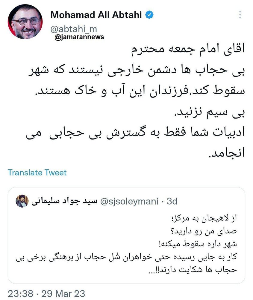 ابطحی به امام جمعه لاهیجان: بی حجاب ها دشمن خارجی نیستند / ادبیات شما فقط به گسترش بی حجابی می انجامد