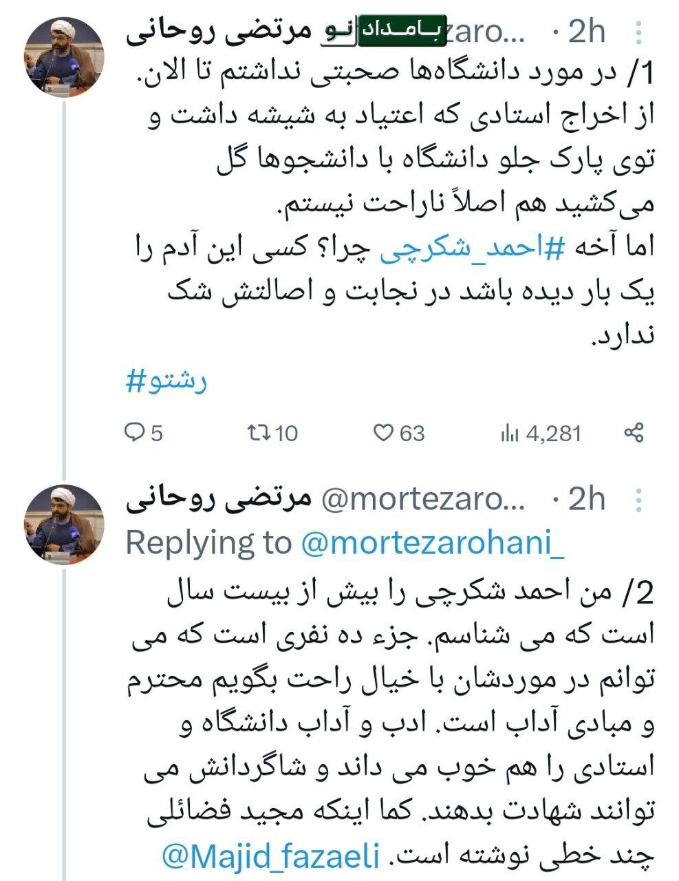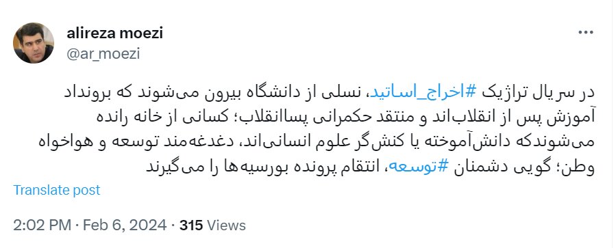 علی معزی، فعال رسانهای نیز در همین باره در شبکه اجتماعی ایکس / توئیتر نوشت: «در سریال تراژیک اخراج اساتید، نسلی از دانشگاه بیرون میشوند که برونداد آموزش پس از انقلاباند و منتقد حکمرانی پساانقلاب؛ کسانی از خانه رانده میشوندکه دانشآموخته یا کنشگر علوم انسانیاند، دغدغهمند توسعه و هواخواه وطن؛ گویی دشمنان توسعه، انتقام پرونده بورسیهها را میگیرند.»