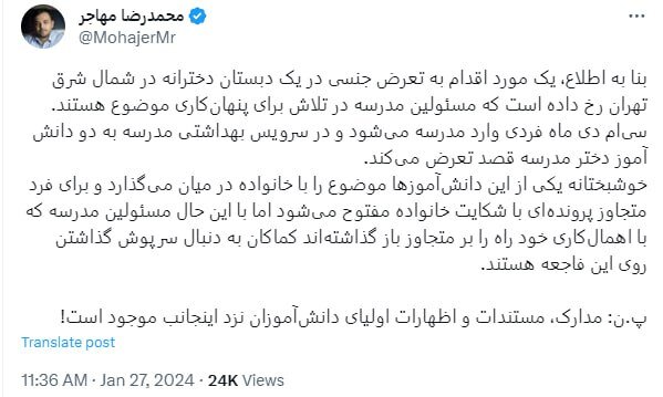 محمدرضا مهاجر در صفحه شخصی خود در شبکه اجتماعی ایکس نوشت: «بنا به اطلاع، یک مورد اقدام به تعرض جنسی در یک دبستان دخترانه در شمال شرق تهران رخ داده است که مسئولین مدرسه در تلاش برای پنهانکاری موضوع هستند.