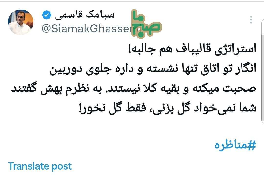 استراتژی قالیباف هم جالبه! انگار تو اتاق تنها نشسته و داره جلوی دوربین صحبت میکنه و بقیه کلا نیستند. به نظرم بهش گفتند شما نمیخواد گل بزنی، فقط گل نخور!