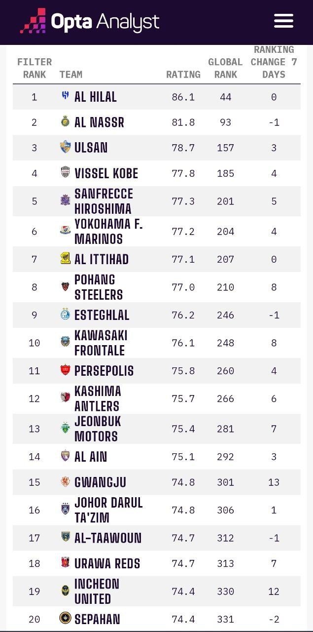 در جدیدترین رنکینگ سایت اوپتا، استقلال توانست در رتبه نهم آسیا و بالاتر از پرسپولیس و سپاهان قرار بگیرد.