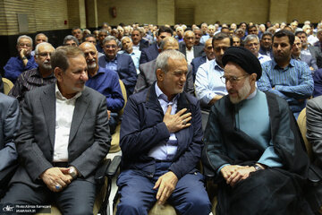 سیدمحمد خاتمی، اسحاق جهانگیری و مسعود پزشکیان در مراسم ختم دکتر میلی منفرد، که امروز، پنجشنبه 24 خرداد، در مسجد نور برگزار شد، در کنار هم دیده شدند.