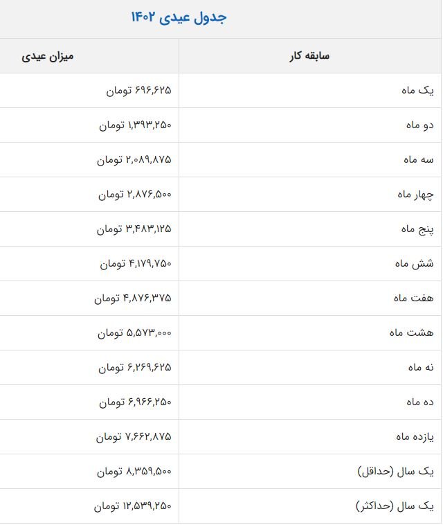جدول زیر میزان دریافت عیدی برای کارگرانی که کمتر از یک سال سابقه کار را دارند روشن کرده است.
