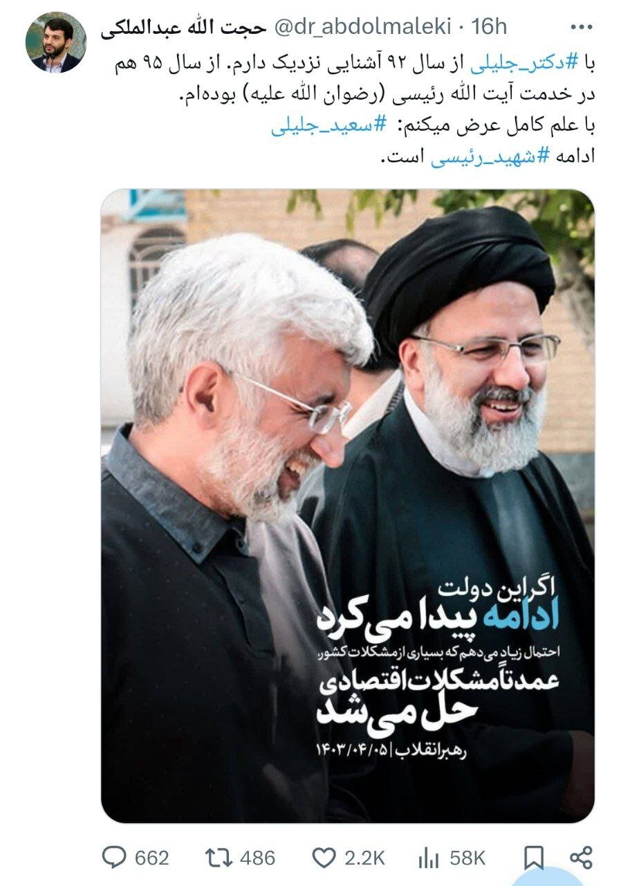 حجت الله عبدالملکی، دبیر شورای عالی مناطق آزاد، در با انتشار یک توئیت ضمن حمایت از سعید جلیلی نوشت: «با دکتر جلیلی از سال 92 آشنایی نزدیک دارم. از سال 95 هم در خدمت آیت الله رئیسی (رضوان الله علیه) بودهام. با علم کامل عرض میکنم: سعید جلیلی ادامه شهید رئیسی است.»