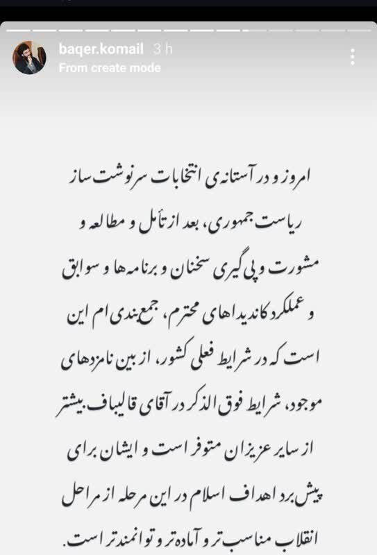همچنین، کمیل باقرزاده، رایزن فرهنگی ایران در لبنان، با انتشار مطلبی در صفحه اینستاگرام خود از قالیباف حمایت کرد.