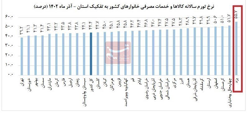بررسی گزارش آذر ماه مرکز امار ایران از شاخص قیمت مصرف کننده نشان میدهد نرخ تورم سالیانه در استان یزد با ثبت رکورد 55.7 درصدی اختلاف بیش از 11 درصدی با نرخ تورم سالیانه کل کشور داشته است.