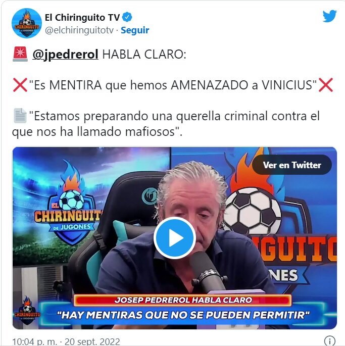 شب گذشته اینیاکی آنگولو، خبرنگار اسپانیایی، در کانال یوتیوب خود فاش کرد که وینیسیوس از سوی مسئولان برنامه الچیرینگیتو تهدید شده بود تا این ویدیو را منتشر نکند چرا که معتقد بودند برای اعتبار و وجهه برنامه خوب نخواهد بود. وینسیوس تهدید شده بود که در صورت انتشار این ویدیو، آنها از هیچ اقدامی برای تخریب شخصیت او در برنامه دریغ نخواهند کرد. جالب اینکه همین اتفاق نیز رخ داد و پس از دربی چند کارشناس الچیرینگیتو از جمله جوزپ پِدرِرول، مجری برنامه، به جای تمجید از نمایش خوب ستاره برزیلی، از رفتار او در جریان بازی به شدت انتقاد کردند. این در حالی است که وینیسیوس در جریان بازی بارها از سوی هواداران اتلتیکو مورد توهین و شعارهای نژادپرستانه قرار گرفت. آنگولو در انتها گفت که برای حرف هایش مدارک مستند و محکمی دارد.