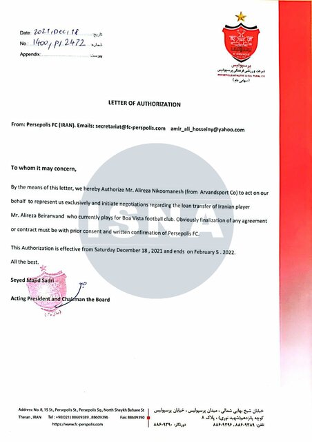 در نامه اول که در تاریخ 18 دسامبر 2021 (27 آذر 1400) به امضای سید مجید صدری (سرپرست وقت باشگاه پرسپولیس) رسیده، این باشگاه به یک مدیر برنامه اجازه میدهد تا به نمایندگی از پرسپولیس اقدام به مذاکره برای انتقال قرضی بیرانوند از باشگاه بواویشتای پرتغال به پرسپولیس کند.