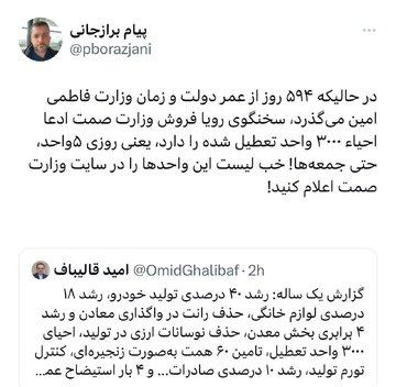 - در جواب او پیام برازجانی سخنگوی سابق وزارت صمت نوشت: در حالیکه 594 روز از عمر دولت و زمان وزارت فاطمی امین می گذرد، سخنگوی رویا فروش وزارت صمت ادعا احیا 3000 واحد تعطیل شده را دارد، یعنی روزی 5 واحد، حتی جمعه ها! خب لیست این واحدها را در سایت وزارت صمت اعلام کنید!