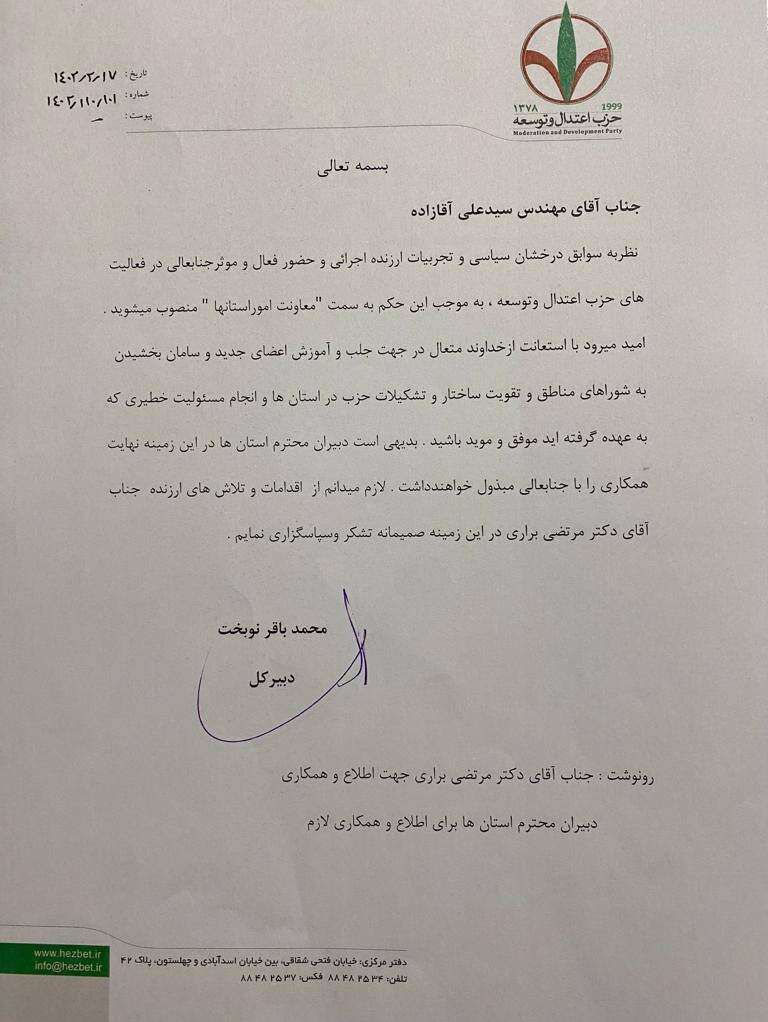 فارس نوشت: دبیرکل حزب اعتدال و توسعه در حکمی سید علی آقا زاده را به عنوان معاون امور استانهای این حزب منصوب کرد.