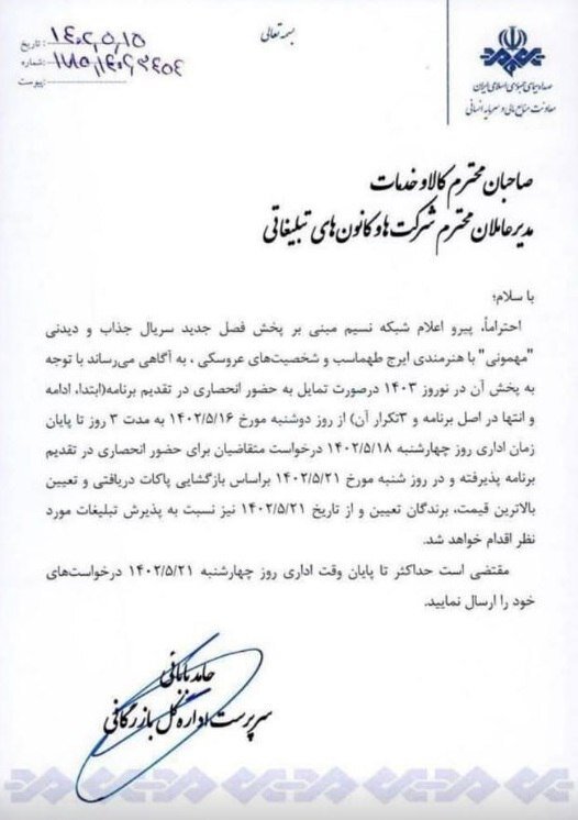 بر اساس نامهای که از اداره کل بازرگانی صداوسیما در فضای مجازی منتشر شده، این اداره کل با اشاره به بازگشت ایرج طهماسب و برنامه محبوبش به قاب تلویزیون، از مدیران شرکتها، صاحبان صنایع و کانونهای تبلیغاتی برای ارائه درخواست خود به منظور تبلیغات انحصاری این برنامه دعوت کرد، تا جایگاه این تبلیغات را به بالاترین مبلغ پیشنهاد ارائه شده اختصاص دهد!