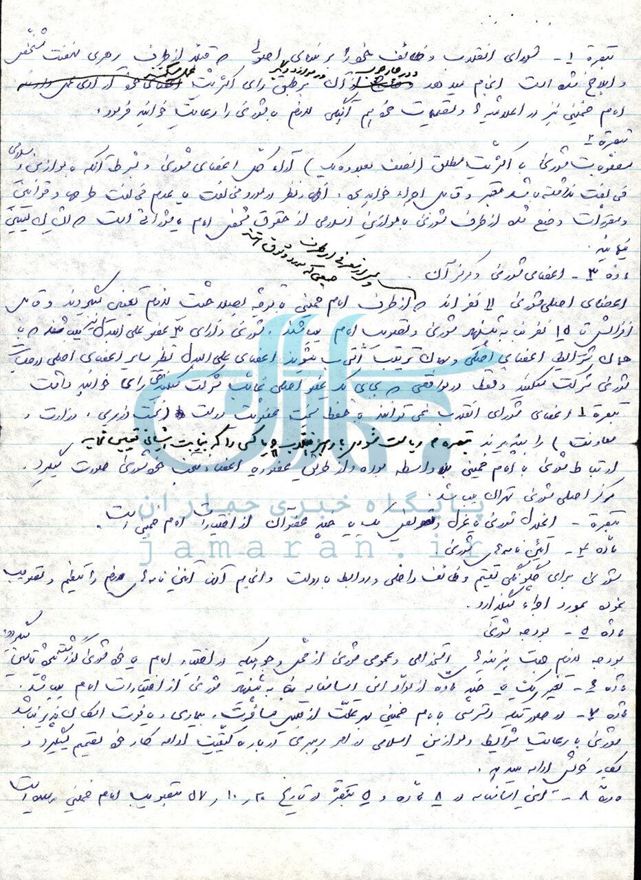 5 - اصلاحیه دیگر امام مربوط به ماده 3 می باشد. عبارت قبل از اصلاح چنین بود: «اعضای اصلی شورا 11 نفرند که از طرف امام خمینی با توجه به صلاحیت لازم تعیین می گردند و..» امام خمینی بعد از جمله «اعضای اصلی شورا 11 نفرند» این عبارت را اضافه نموده است: «پس از معرفی از طرف جمعی که مورد وثوق هستند». یعنی اینکه اعضای شورای انقلاب مستقیما توسط ایشان تعیین نمی شوند، بلکه اعضای پیشنهادی توسط هیأتی که امام تعیین کرده بود معرفی و با تأیید امام به عضویت شورای انقلاب در می آیند.