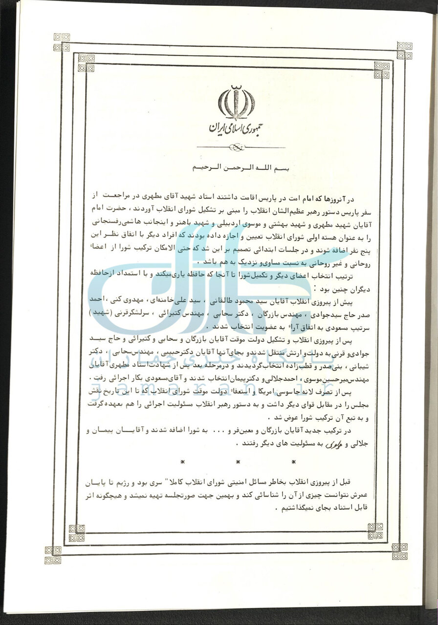 شورای انقلاب که پاسدار ثمرات قریب یک قرن مبارزات آزادیخواهانه و استقلال طلبانه و حق پرستی ملت ایران بالاخص انقلاب اسلامی ضد استبدادی و ضد استیلای خارجی پانزده ساله اخیر به رهبری امام خمینی می باشد. بمنظور اجرای اهداف انقلاب در آستانه پیروزی و برای ایجاد حکومت جمهوری اسلامی در ایران انتخاب و تشکیل می گردد.