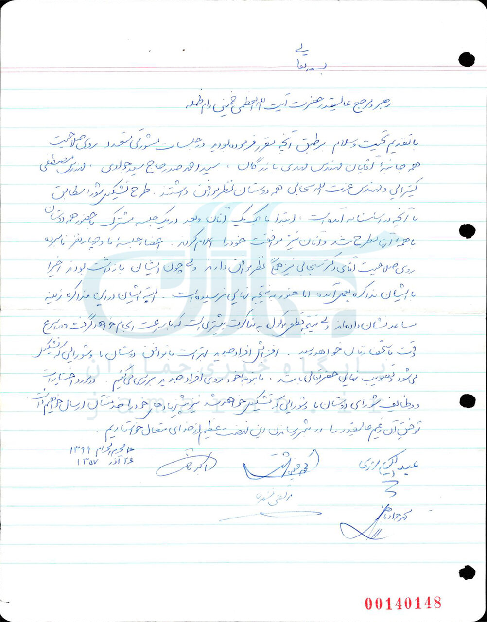 با تقدیم تحیت و سلام بر طبق آنچه مقرر فرموده بودید در جلسات مشورتی متعدد روی صلاحیت همه جانبه آقایان مهندس مهدی بازرگان، سید احمد صدر حاج سید جوادی، مهندس مصطفی کتیرایی و مهندس عزت الله سحابی همه دوستان نظر موافق داشتند. طرح تشکیل شورا مطابق با آنچه در اساسنامه آمده است، ابتدا با یک یک آنان و بعد در یک جلسه مشترک با حضور همه دوستان با همه آنها مطرح شد و آنان نیز موافقت خود را اعلام کردند. اعضاء جلسه ما و چهار نفر نامبرده روی صلاحیت آقای دکتر سنجابی نیز همگی نظر موافق دارند ولی چون ایشان بازداشت بودند اخیرا با ایشان مذاکره بعمل آمده اما هنوز به نتیجه نهایی نرسیده است. البته ایشان در این مذاکره زمینه مساعد نشان داده اند ولی نتیجه قطعی موکول به مذاکرت بیشتری است که با سرعت انجام خواهد گرفت و در اسرع وقت به استحضارتان خواهد رسید. افزایش افراد جدید بهتر است با توافق دوستان ما و شورایی که تشکیل می شود و تصویب نهایی حضرتعالی باشد. ما به نوبه خود روی افراد جدید بررسی می کنیم. در مورد اختیارات و وظایف شورای دوستان ما و شورایی که تشکیل خواهد شد نیز پیشنهادهای خود را خدمتتان ارسال خواهیم داشت. توفیق آن زعیم عالیقدر را در بثمر رساندن این نهضت عظیم از خدای متعال خواستاریم.