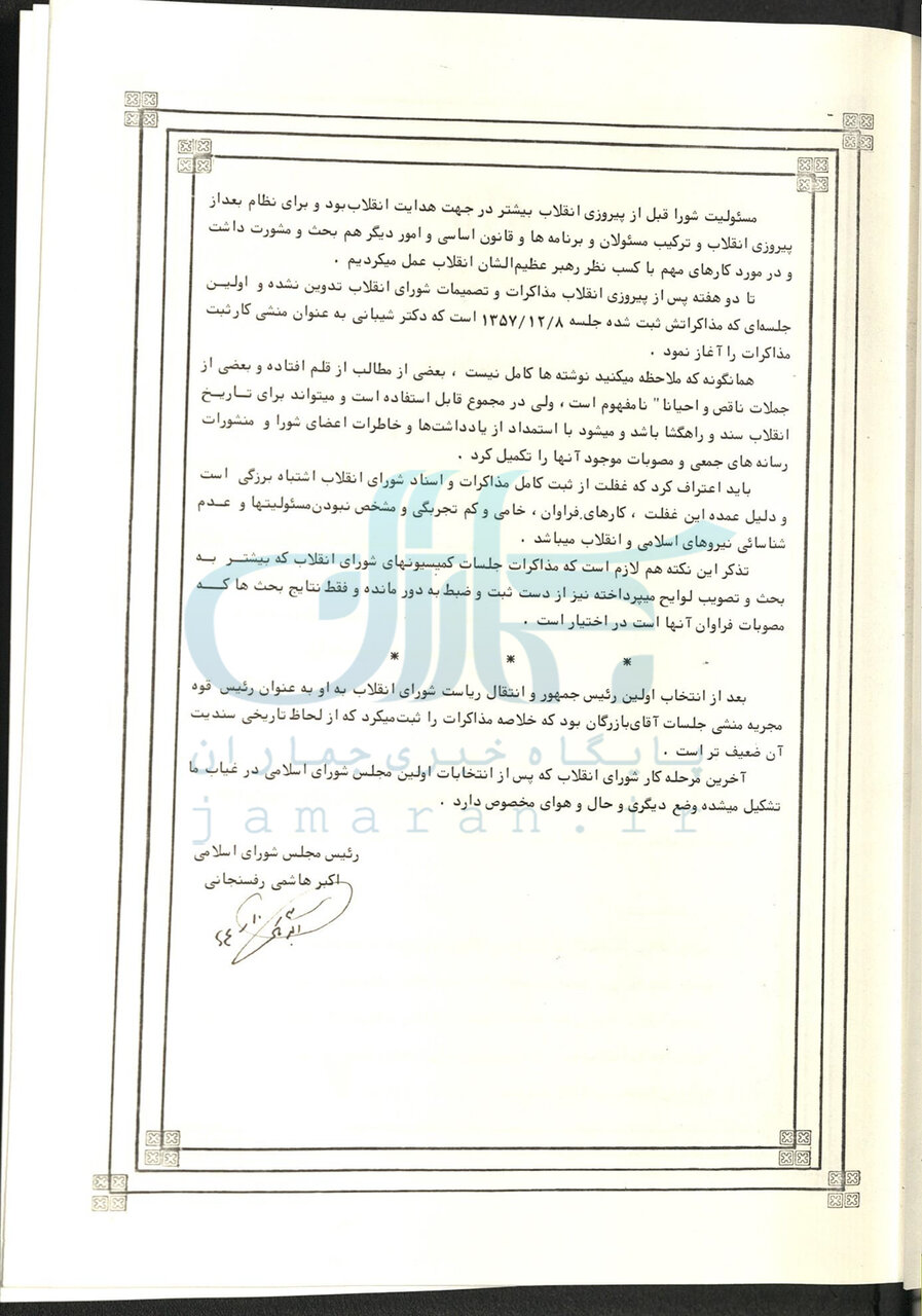 تصویر یادداشت آیت الله هاشمی رفسنجانی در مقدمه صورت مذاکرات شورای انقلاب: