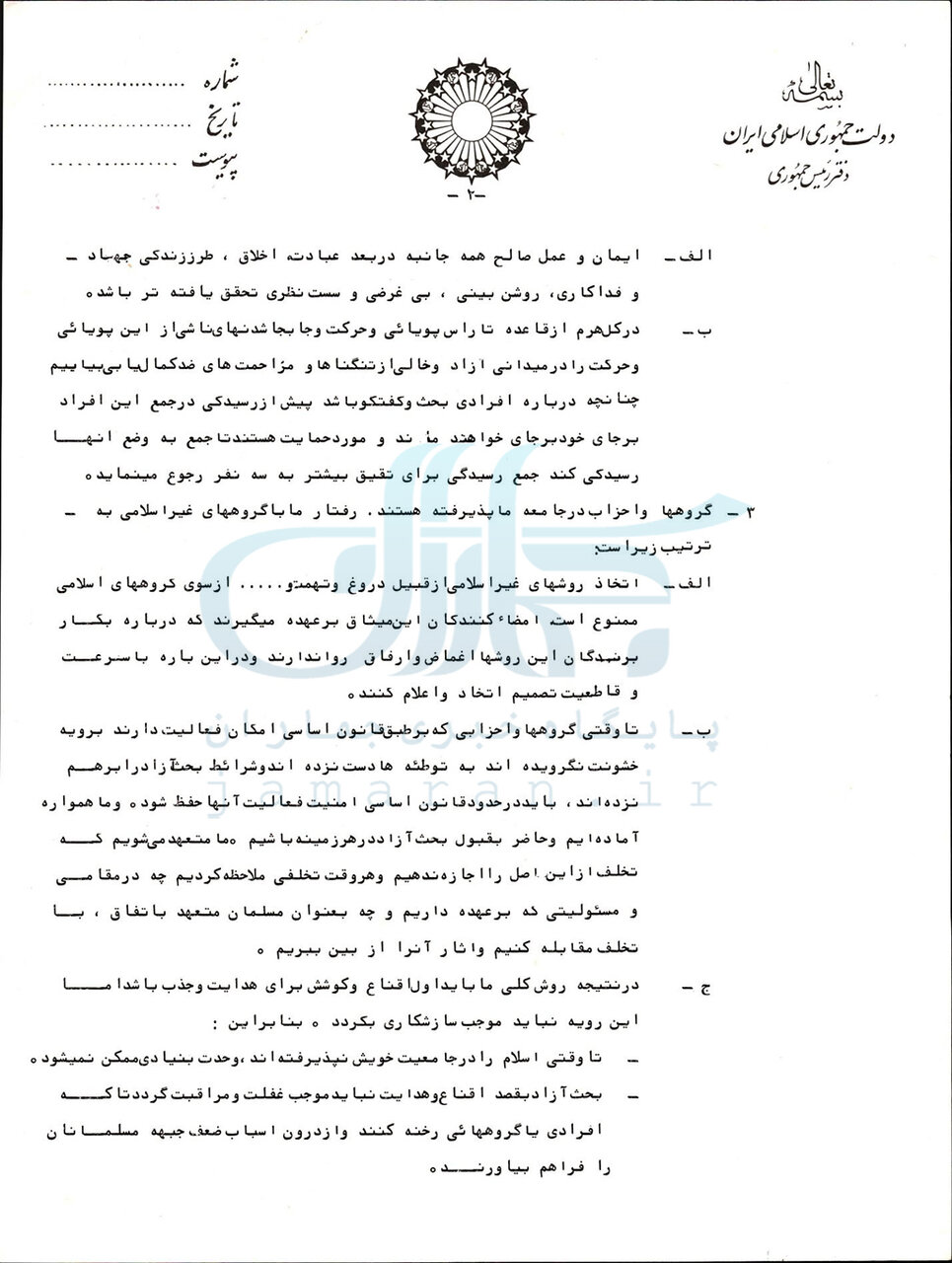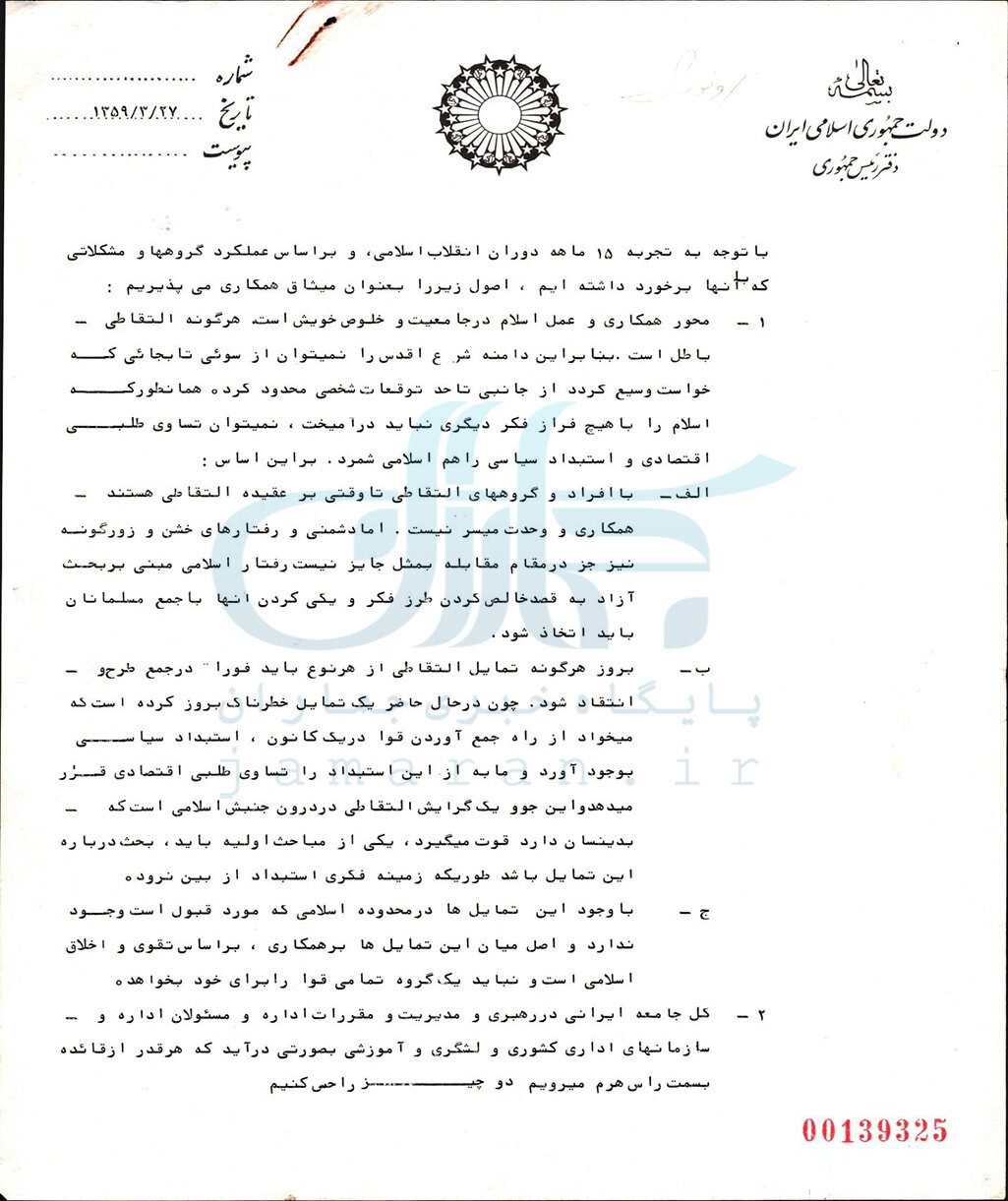 تصویر متن تایپ شده میثاقنامه که همراه با دستخط آن در پایان خرداد 1359 برای دفتر امام ارسال شده بود: