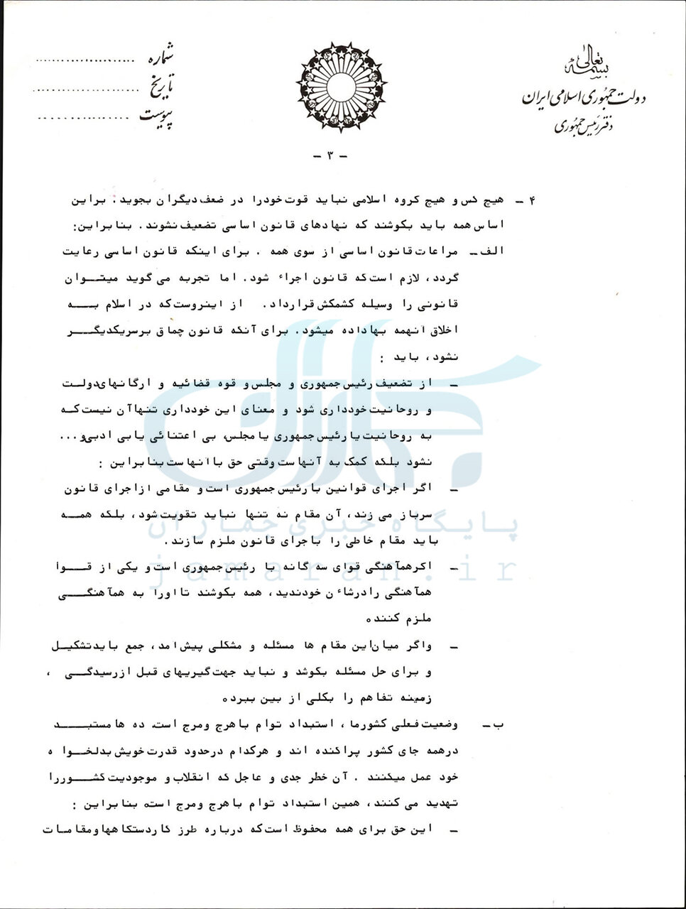 3 - دو سطر پایانی نامه نیز اشتباهی را که در برخی خاطرات و مقالات، تاریخ جلسات شورای انقلاب را آبان و آذر سال 57 ذکر کرده اند تصحیح می نماید. بنابر این و به استناد مدارک مختلف می توان گفت نخستین جلساتی که به عنوان شورای انقلاب اسلامی بصورت رسمی و بر طبق اساسنامه تشکیل شده است در دیماه 1357 به بعد بوده است.