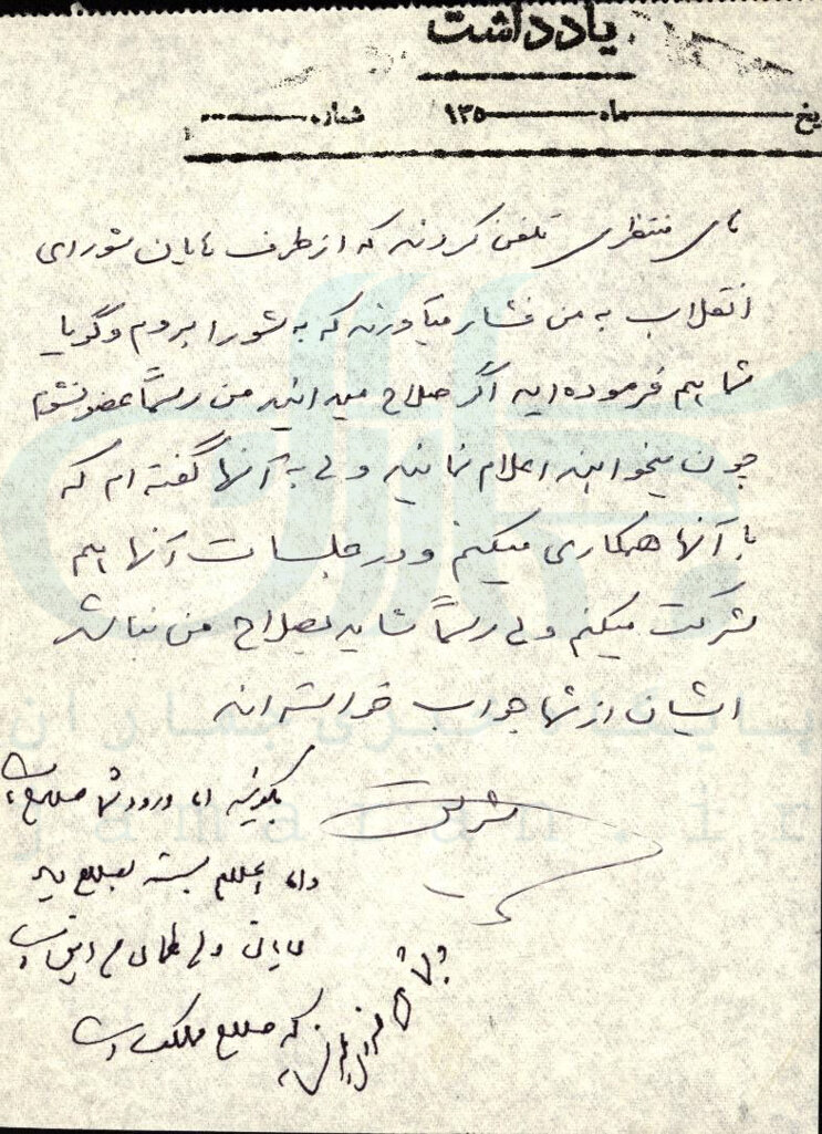 «آقای منتظری تلفن کردند که از طرف آقایان شورای انقلاب به من فشار می آورند که به شورا بروم وگویا شما هم فرموده اید؛ اگر صلاح می دانید من رسماً عضو نشوم؛ چون می خواهند اعلام نمایند؛ ولی به آنها گفته ام که با آنها همکاری می کنم و در جلسات آنها هم شرکت می کنم ولی رسماً شاید به صلاح من نباشد. ایشان از شما جواب خواسته اند»