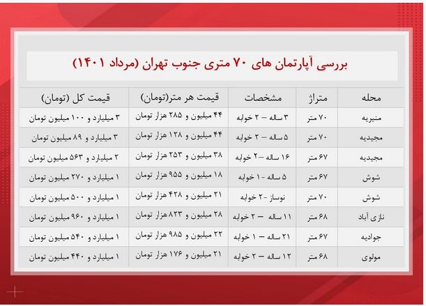 اقتصادآنلاین نوشت: در گزارش زیر به بررسی قیمت و مشخصات آپارتمانهای 70 متریجنوب تهران خواهیم پرداخت.