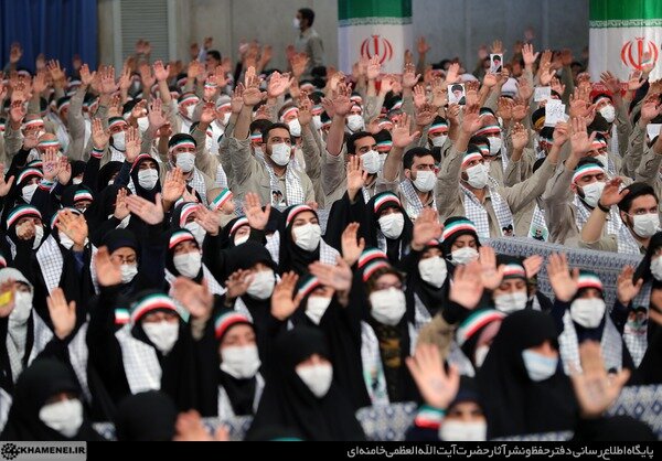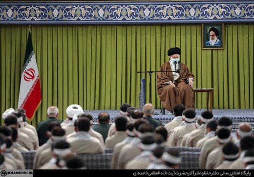 حضرت آیتالله خامنهای با تأکید بر اینکه ممکن است یک نفر حتی جمهوری اسلامی را قبول نداشته باشد اما هیچ ایرانی با غیرتی حاضر نیست چنین باجهایی را بدهد، گفتند: بنابراین مذاکره با آمریکا مشکلی را حل نمیکند و تنها در صورت باج دادن در همه مسائل اساسی و عبور از همه خطوط قرمز است که آمریکا مانند دوره پهلوی دیگر کاری با کشور ندارد. اما آیا مردم برای این شیوه، انقلاب کردند و این همه شهید دادند؟ ایشان در مقابل تجویز دیگر برخی مدعیان مبنی بر «شنیدن صدای ملت» خاطرنشان کردند: صدای رعدآسای ملت، امسال در 13 آبان بلند شد؛ آیا آن را شنیدید؟ شما بشنوید صدای ملت را. آن جمعیت عظیم و بیش از 10 میلیونی در تشییع شهید سلیمانی صدای ملت بود. امروز تشییع شهدا در شهرهای مختلف و شعارهای مردم علیه تروریسم و اغتشاشگر صدای ملت است. شما صدای ملت را نمیشنوید؟ رهبر انقلاب در بخش پایانی سخنانشان به بیان چند توصیه به بسیجیان پرداختند: «بسیجی بمانید و روحیه و ایمان بسیجی را در خود حفظ کنید»، «قدر خود را بدانید البته خاصیت بسیجی تفاخر نکردن است اما قدر این توفیق خدادای را بدانید»، «دشمن و نقاط ضعف و نقشههای آن را بشناسید و در مقابل دشمنی که با بزرگ و قوی جلوه دادن خود به دنبال غافلگیر کردن شما است، هوشیار باشید»، و «رشد معنوی خود را مراقبت و اندازهگیری کنید». ایشان در توصیه پنجم به بسیجیان گفتند: امروز مهمترین شیوه بدخواهان، جعل و دروغپردازی به وسیله تلویزیونهایشان یا فضای مجازی است، در مقابل این شگرد با عمل به وظیفه جهاد تبیین، «روشنبینی خود را افزایش دهید» و اجازه ندهید دشمنی که بیش از تسلط بر سرزمینها به دنبال تسلط بر مغزها است، به این هدف دست یابد. رهبر انقلاب در توصیه ششم با تأکید بر اینکه «آمادگی عملی خود را حفظ کنید و غافلگیر نشوید»، گفتند: حواس همگان بخصوص مسئولان کشور باید در خصوص مسائل اطراف کشور هم جمع باشد چرا که برای ما هم منطقه غرب آسیا، هم قفقاز و هم مناطق شرقی کشور مهم است و باید حواس ما به همه اینها باشد که دشمن چه کاری میخواهد انجام دهد؟ حضرت آیتالله خامنهای با اشاره به استفاده مستکبران از فرصت جام جهانی و غفلت ناشی از تمرکز همه چشمها به آن برای انجام کارهای دیگر (مانند دورههای قبلی این مسابقات)، مراقبت و هوشیاری در این مقطع را مورد تأکید قرار دادند و افزودند: اکنون که اسم جام جهانی را آوردیم بگوییم که دیروز بچههای تیم ملی ما چشم ملت را روشن کردند و انشاءالله چشمشان روشن باشد که ملت را خوشحال کردند. ایشان در توصیه هفتم، بسیجیان را به مراقبت از نفوذ افراد ناباب و فاسد در بسیج سفارش کردند و توصیه آخر خود را به یک دستور قرآنی اختصاص داند که «سست نشوید و غمگین نگردید، شما برترید اگر ایمان داشته باشید».