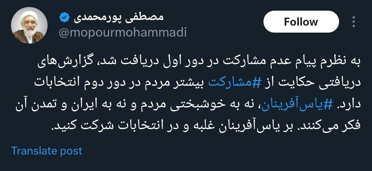 همچنین مصطفی پورمحمدی، دبیر جامعه روحانیت مبارز، با انتشار یادداشتی در شبکه اجتماعی ایکس نوشت: