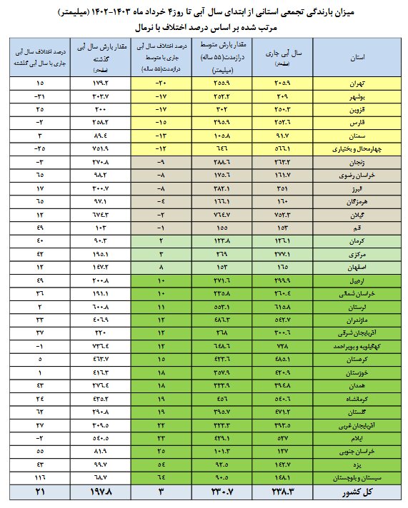 همچنین ارتفاع کل ریزشهای جوی کشور معادل 238.3 میلیمتر است. این مقدار بارندگی نسبت به میانگین دورههای مشابه درازمدت (230.7 میلیمتر) 3 درصد افزایش و نسبت به دوره مشابه سال آبی گذشته (197.8 میلیمتر) 21 درصد افزایش را نشان میدهد.