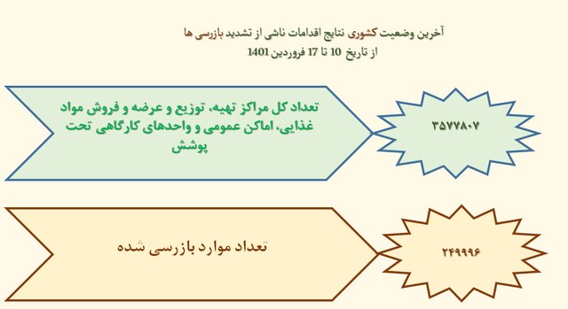در عین حال طبق اعلام معاونت بهداشت وزارت بهداشت، بر اساس اقدامات ناشی از تشدید بازرسیها از تاریخ 10 تا 17 فروردین ماه 1401، از تعداد 3577807 مرکز تهیه، توزیع و عرضه و فروش مواد غذایی، اماکن عمومی و واحدهای کارگاهی تحت پوشش، بالغ بر 249996 مورد بازرسی انجام شده است.