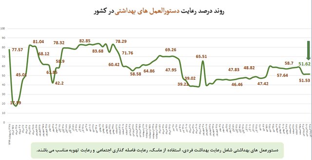 بر اساس اعلام معاونت بهداشت وزارت بهداشت، میزان رعایت پروتکلهای بهداشتی در کشور در هفته منتهی به 20 فروردین ماه 1401 (از 13 تا 20 فروردین ماه)، همچنان پایین و بالغ بر 51.62 درصد بوده است.