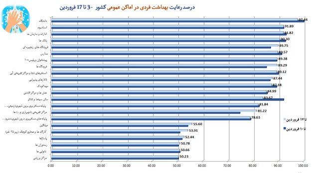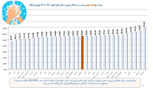 در عین حال میانگین میزان رعایت بهداشت فردی در اماکن عمومی استانهای کشور در بازه زمانی 10 تا 17 فروردین ماه 1401، بالغ بر 55.60 درصد بوده است. در این شاخص بیشترین میزان رعایت در استان هرمزگان با 70.41 درصد و کمترین میزان رعایت هم در استان تهران 47.42 درصد بوده است.