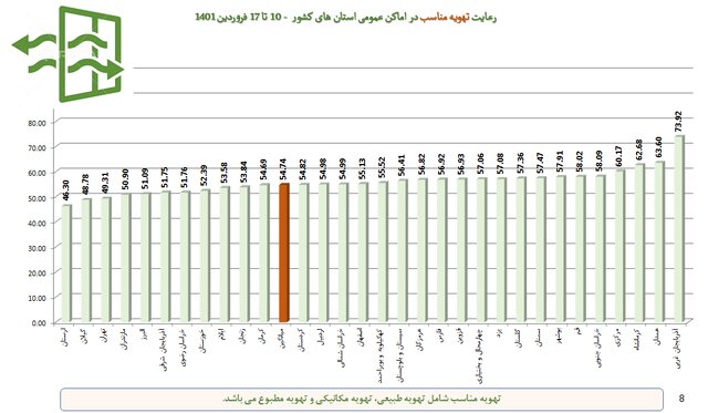 میانگین رعایت تهویه مناسب در اماکن عمومی استانهای کشور از 10 تا 17 فروردین ماه 1401، 54.74 درصد بوده است. در عین حال بیشترین میزان رعایت مربوط به استان آذربایجان غربی با 73.92 درصد و کمترین میزان رعایت مربوط به لرستان با 46.30 درصد بوده است.