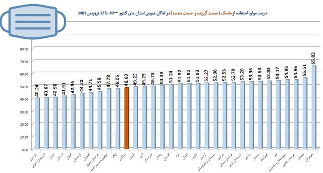 میانگین استفاده از ماسک در شاغلین و خدمت گیرندگان به تفکیک اماکن عمومی استانهای کشور از 10 تا 17 فروردین ماه 1401 بالغ بر 48.63 درصد بوده است که بیشترین میزان رعایت در استان هرمزگان با 65.82 درصد و کمترین میزان رعایت مربوط به مازندران با 40.24 درصد بوده است.