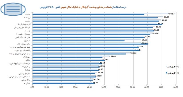 همچنین میانگین استفاده از ماسک در شاغلین و خدمت گیرندگان به تفکیک اماکن عمومی کشور نیز از 3 تا 17 فروردین ماه 1401 بالغ بر 48.63 درصد بوده است که بیشترین میزان استفاده از ماسک در اماکن عمومی مربوط به دانشگاهها با 94.87 درصد و کمترین میزان استفاده از ماسک مربوط به نانواییها با 41.31 درصد است.