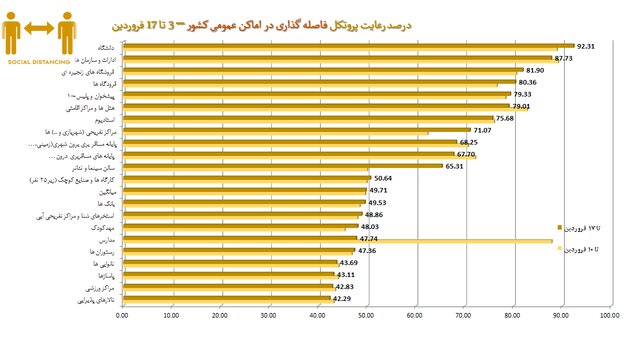 همچنین میانگین درصد رعایت پروتکل فاصلهگذاری در اماکن عمومی کشور از 3 تا 17 فروردین ماه 1401، 49.71 درصد بوده که دانشگاهها با 92.31 درصد بیشترین درصد رعایت و تالارهای پذیرایی با 42.29 درصد کمترین میزان رعایت را داشتهاند.