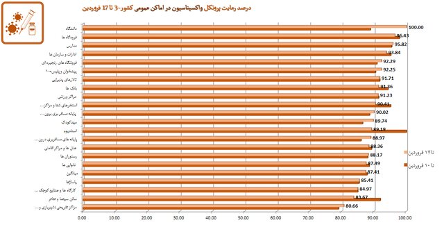 در عین حال وضعیت واکسیناسیون در اماکن عمومی کشور از 3 تا 17 فروردین ماه 1401، را میتوانید در نمودار زیر مشاهده کنید: