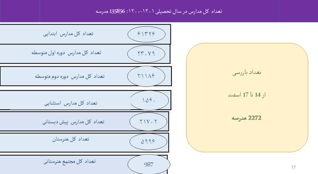 از 14 تا 17 فروردین ماه 1401 از 2272 مدرسه بازرسی انجام شده است.