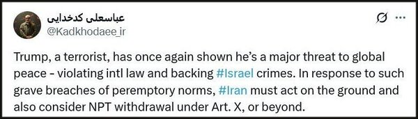 توئیت کدخدایی به زبان انگلیسی / خروج از NPT و بالاتر از آن باید در دستور مقامات ذیربط قرار گیرد