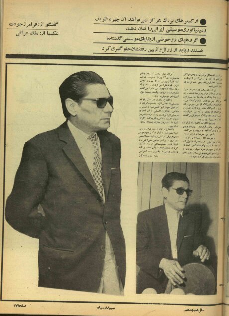 صوفیان و درویشان هم همینطور. برای همین هم موسیقی ما خودبهخود به ناچار رنگ و بوی حزنانگیزی به خود گرفت زیرا که مسلما موسیقی که مورد استفادهی صوفی و درویش و تعزیهخوان قرار گیرد کمتر میتوان در آن رگههایی از آنچه که به آن تحرک میگویند یافت. از این گذشته همین باعث گردید موسیقی ما به اسارت آواز درآید و در تمامی موسیقی ما همیشه این آواز بوده که اصل بوده و موسیقی همراهکنندهی آن.
