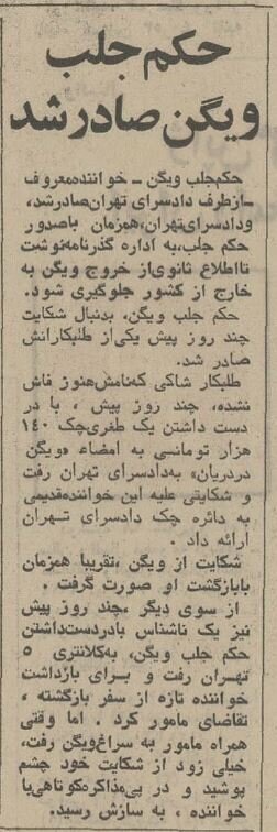 به خبرگزاری خبرآنلاین به نقل از اطلاعات آنلاین، شادروان ویگن دردریان (1308-1382) خواننده چند ترانه ماندگار تاریخ موسیقی ایران همچون «دل دیوانه»، «سوگند» و «بارون بارونه» در سال 1353 بعد از چند سال زندگی در آمریکا به ایران بازگشت. حضور ویگن در تهران همزمان با بروز اختلافات مالی او با چند نفر شد. روزنامهی اطلاعات 19 شهریور 1353 در این باره خبری منتشر کرد. خبر را بخوانید و عکسی از بازگشت ویگن به ایران در فرودگاه مهرآباد به همراه چند عکس یادگاری ویگن با غلامرضا تختی، فرانک سیناترا، شعبان جعفری و آلفرد هیچکاک تماشا کنید.