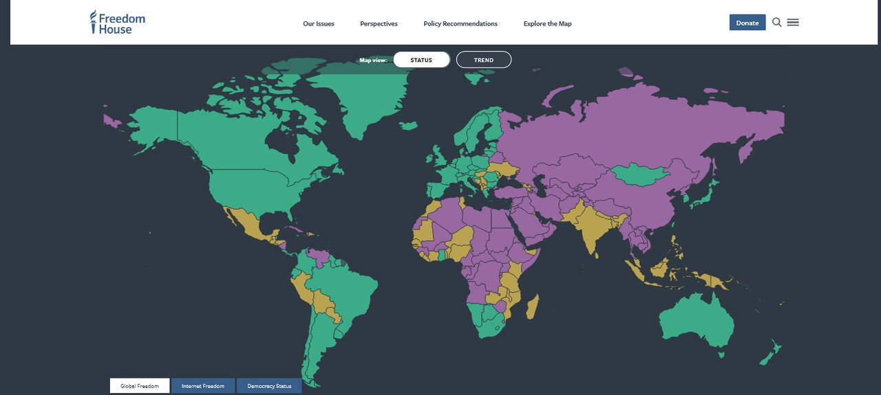 آخرین نقشه خانه آزادی از آزادی جهانی! | تاریخ به روزرسانی: سال 2022اما خانه آزادی، این کشورها را به دلیل قرابت سیاست خارجی آنان حزب دموکرات آمریکا، در زمره سرزمینهای دارای آزادی نسبی طبقه بندی کرده است. این نشان میدهد که خانه آزادی طبق میل حزب دموکرات آمریکا نقشه را ترسیم میکند. یکی از دلایل آن شاید این است که خاستگاه این نهاد نیز روزولت دموکرات بود.