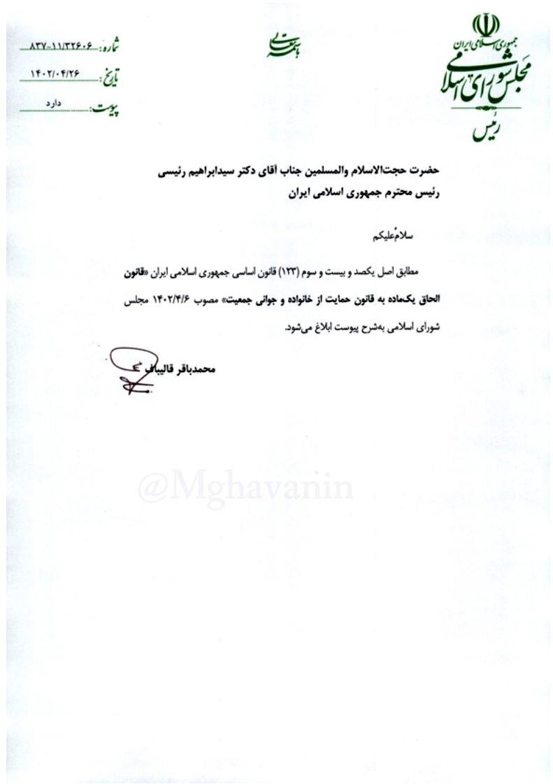 محمدباقر قالیباف رئیس مجلس شورای اسلامی طی نامهای به حجتالاسلام سید ابراهیم رئیسی رئیس جمهور، قانون الحاق یک ماده به قانون حمایت از خانواده و جوانی جمعیت را ابلاغ کرد.