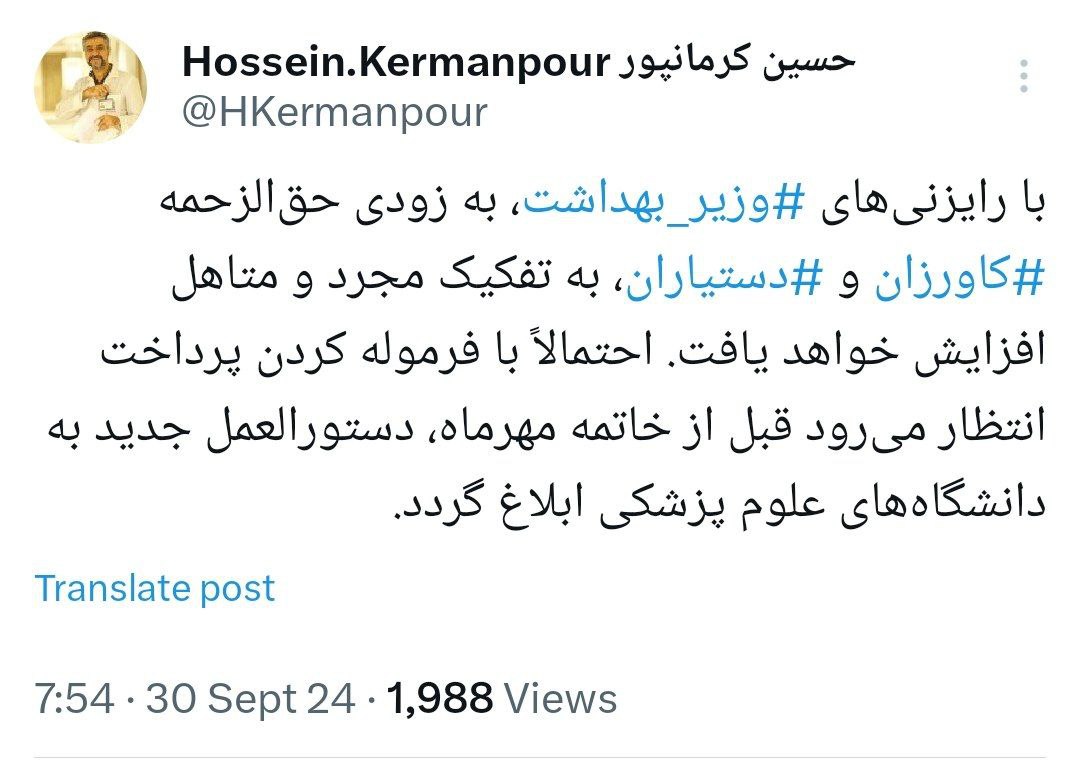 به گزارش خبرآنلاین، حسین کرمانپور، سرپرست روابط عمومی وزارت بهداشت در شبکه اجتماعی ایکس درباره پرداخت حق الزحمه کادر درمان نوشت: «با رایزنیهای وزیر بهداشت به زودی حق الزحمه کارورزان و دستیاران به تفکیک مجرد و متاهل افزایش خواهد یافت. احتمالاً با فرموله کردن پرداخت انتظار میرود قبل از خاتمه مهرماه، دستورالعمل جدید به دانشگاههای علوم پزشکی ابلاغ گردد.