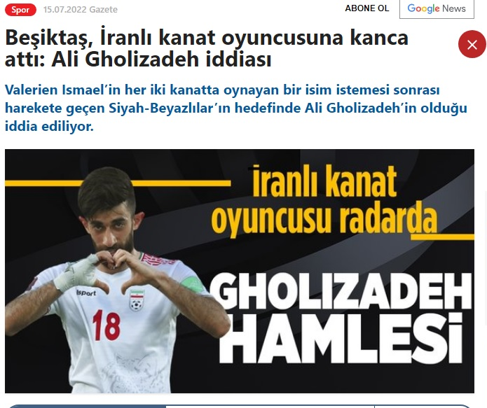 سایت «takvim» ترکیه خبر داد باشگاه بشیکتاش برای تقویت خط میانی اش در فصل جدید سوپر لیگ ترکیه به دنبال جذب علی قلی زاده هافبک ملی پوش ایرانی است.