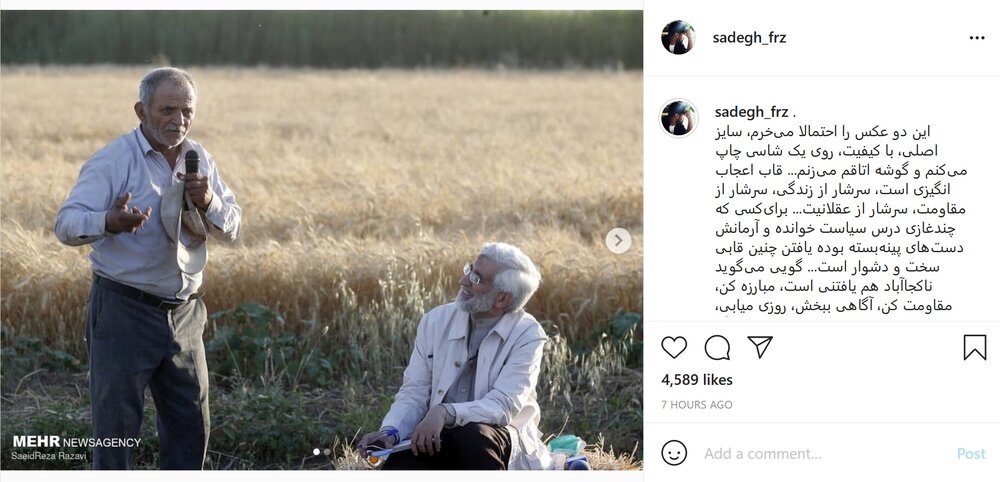 در نمونه ای جالب، که تصویری از سعید جلیلی در جریان انتخابات1400 و بین کشاورزان منتشر شد و در حالی که او روی زمین نشسته و کشاورزان با لباس هایی متنوع از اقوام مختلف عرب و ترکمن و.. ایستاده اند، در رسانه های حامی او تصویری در قاب «امام خمینی (ره)»،«یادآور حضور رجاییها»،«کپی امامین انقلاب»،«از جنس مردم» و «شبیهترین صحنهها به گفتار حضرت امام» توصیف شد. توصیفاتی اغراق آمیز برای اسطوره سازی از جلیلی که هیچ نگاهی به عملکرد او در شش سال دبیری شورای عالی امنیت ملی و ایفای نقش به عنوان سرتیم مذاکره کننده ایران در مذاکرات پرونده ی هسته ای که به تحمیل شش قطعنامه سازمان ملل منجر شد، ندارد.