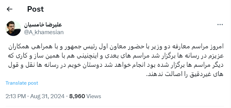 به گزارش خبرگزاری خبرآنلاین، علیرضا خامسیان، معاون ارتباطات و اطلاع رسانی دفتر عارف معاون اول رئیس جمهور، با انتشار یادداشتی در شبکه اجتماعی ایکس، نوشت: