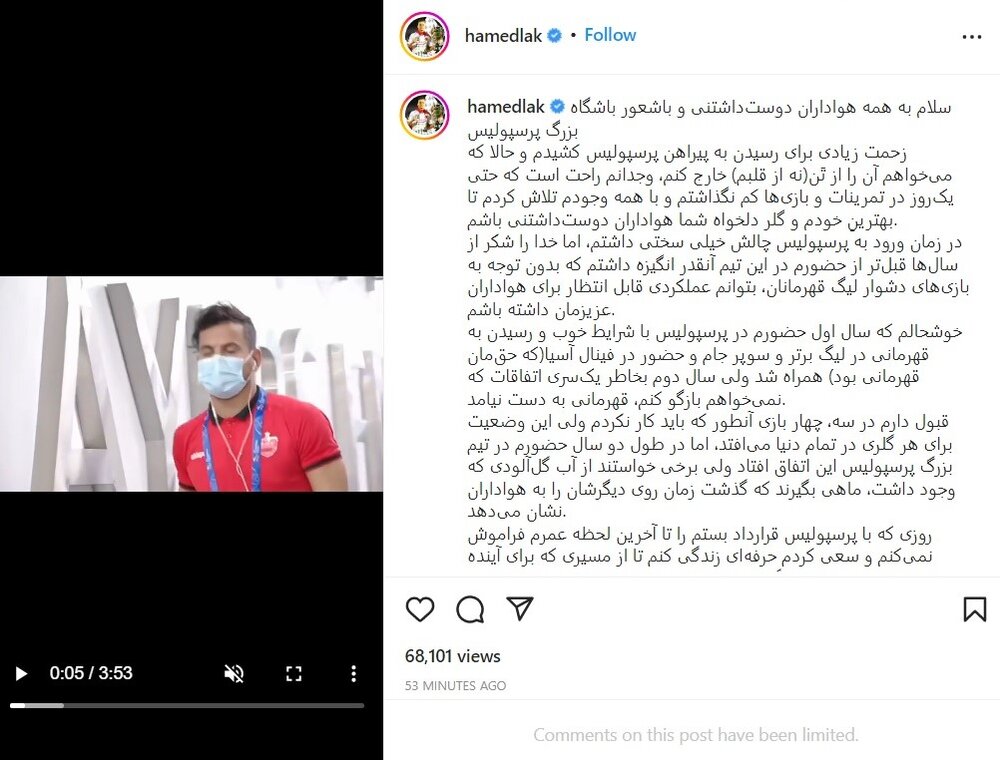 به گزارش خبرگزاری خبرآنلاین؛ حامد لک با انتشار یک پست در اینستاگرام و همچنین، یک متن نسبتا طولانی به ماجرای جدایی اش از باشگاه پرسپولیس واکنش نشان داد.