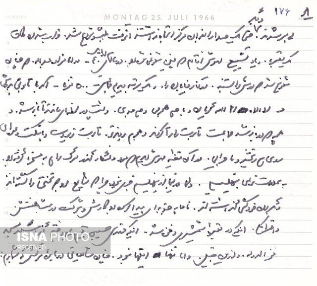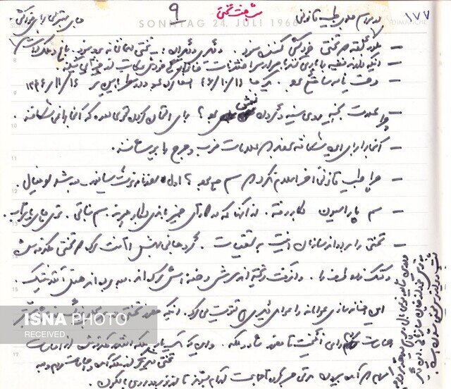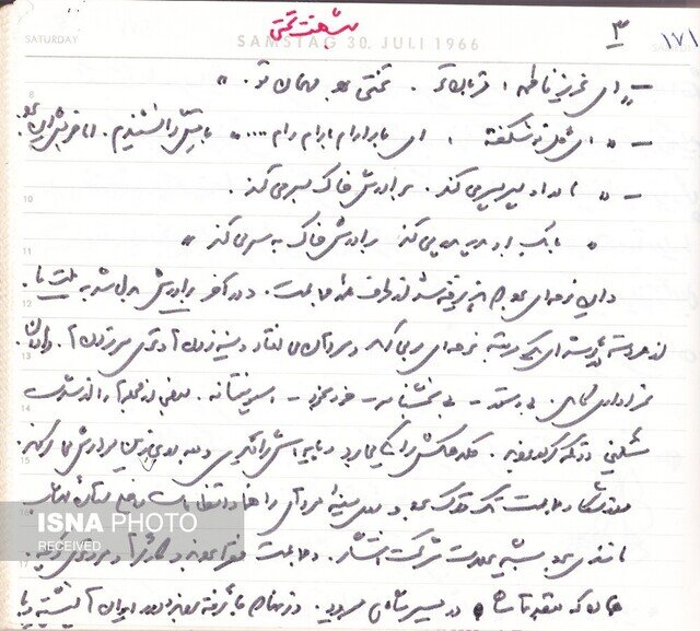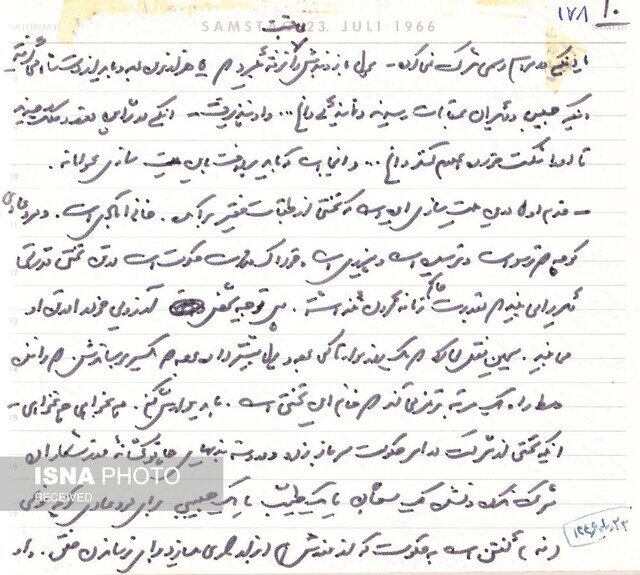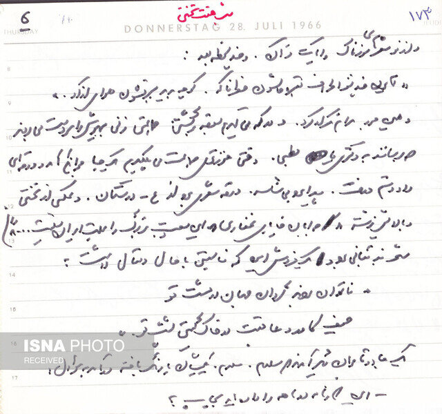 «و 5/3 صدای الرحمن از بلندگو برخاست که راه افتادیم به گشت دیگری. قرار بود پنج ختم بشود، ولی زودتر برچیدند و بعد از الرحمن، تشکر برادر تختی که پیدا بود از روی کاغذی میخواند. و صدای بلندگو که در آن واحد، قرآن خوان و واعظ و شعرخوان و دستوردهنده بود. وقتی برید، یعنی مردم بیسر شدند، و دیگر حتی یک صدا را بعنوان مرکز اتجاه [7] نداشتند، آنوقت بلبشو شروع شد. خراب شدن طاق یک مقبره. و یاد تشییع مهوش [8] افتادم... در آن قضیه مهوش دیدم که مردِ ولنگار گذر مرگ را هم به مسخره گرفته بود، به علامت نوعی نهیلیسم، ولی در اینجا از نهیلیسم خبری نبود، چرا که شایع بود که تختی را کشتهاند، و به گردن خودکشی گذاشتهاند. ناچار جذبهای پیدا کرده بود کارش و شرکت در شب هفتش. و احترامکی، اینکه در مقبره شمشیری دفن شد، اینکه مهندس حسیبی [9] قیم بود و ختم گذاشت در مسجد فخرالدوله. و ازین قبیل. و اما تنها اینها نبود چنان شایعاتی درباره مرگش که بشمارم: