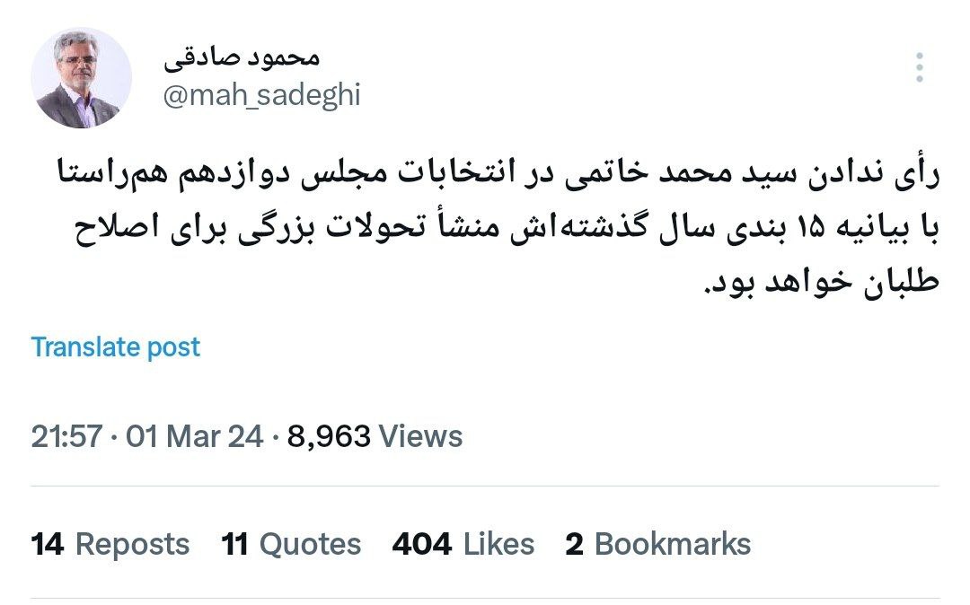 به گزارش خبرگزاری خبرآنلاین، محمود صادقی، نماینده سابق مجلس شورای اسلامی در توییتر نوشت: رأی ندادن سید محمد خاتمی در انتخابات مجلس دوازدهم همراستا با بیانیه 15 بندی سال گذشتهاش منشأ تحولات بزرگی برای اصلاح طلبان خواهد بود.