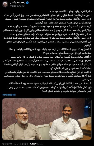 8. هدف من هم از انتشار این توییت دفاع از جناب سعید محمد بود که متأسفانه خودشان با شتابزدگی کار را خراب کردند. امیدوارم که آقای سعید محمد زین پس با تأمل با مسایل مواجه شوند و پختهتر عمل کنند!»