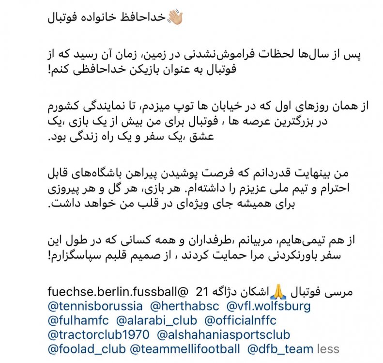 یه گزارش خبرگزاری خبرآنلاین؛ اشکان دژاگه هافبک تهاجمی و وینگر سالهای نه چندان دور تیمهای ولفسبورگ، فولام، ناتینگهام فارست و... که برای دوره طولانی در تیم ملی ایران بازی کرد، با انتشار پستی در اینستاگرام از فوتبال خداحافظی کرد.